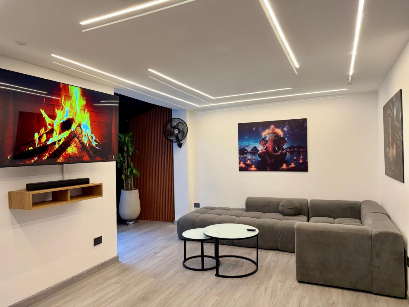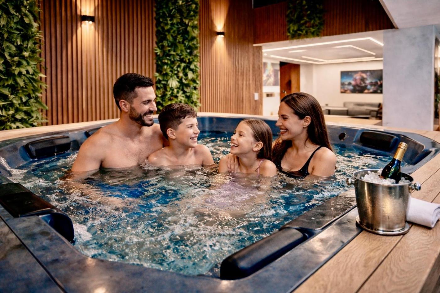 Four-Bedroom House. The hot tub is the standout feature of this holiday home. Boasting 4 bedrooms and 4 bathrooms, this spacious holiday home has a living room and terraceyou can relax. The holiday homes kitchen is available for cooking and storing food. Featuring a balcony, this holiday home also features air conditioning, a washing machine and a flat-screen TV. The unit offers 8 beds.